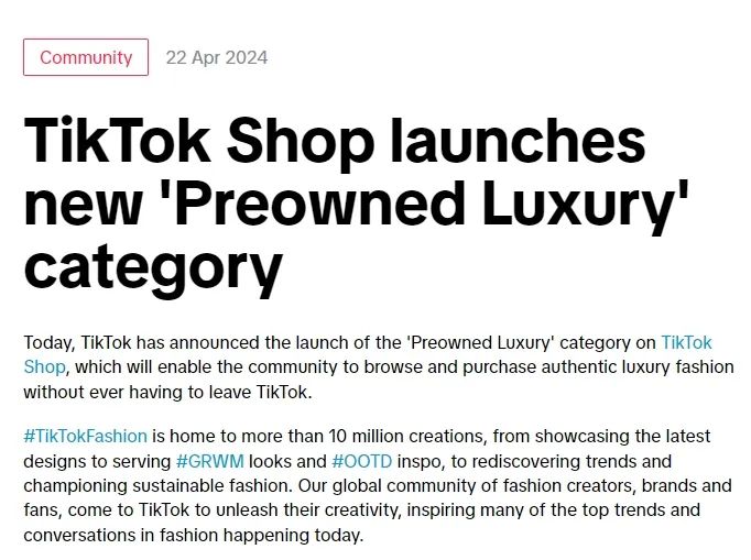 今日,TikTok Shop UK推出二手奢侈品时尚品类,合作多个品牌,旨在吸引全新受众。这将使社区无需离开 TikTok 即可浏览和购买正宗的奢侈品时尚。