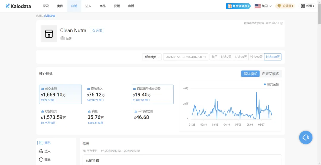 TikTok Clean Nutra是亚马逊和TikTok Shop美国站上的热门健康用品品牌,专注于营养补充剂。过去半年在TikTok已售出35.76万件产品,销售额达1669万美元,主要通过联盟达人来成交,占比94.28%,显示出强大的市场表现和消费者认可度。