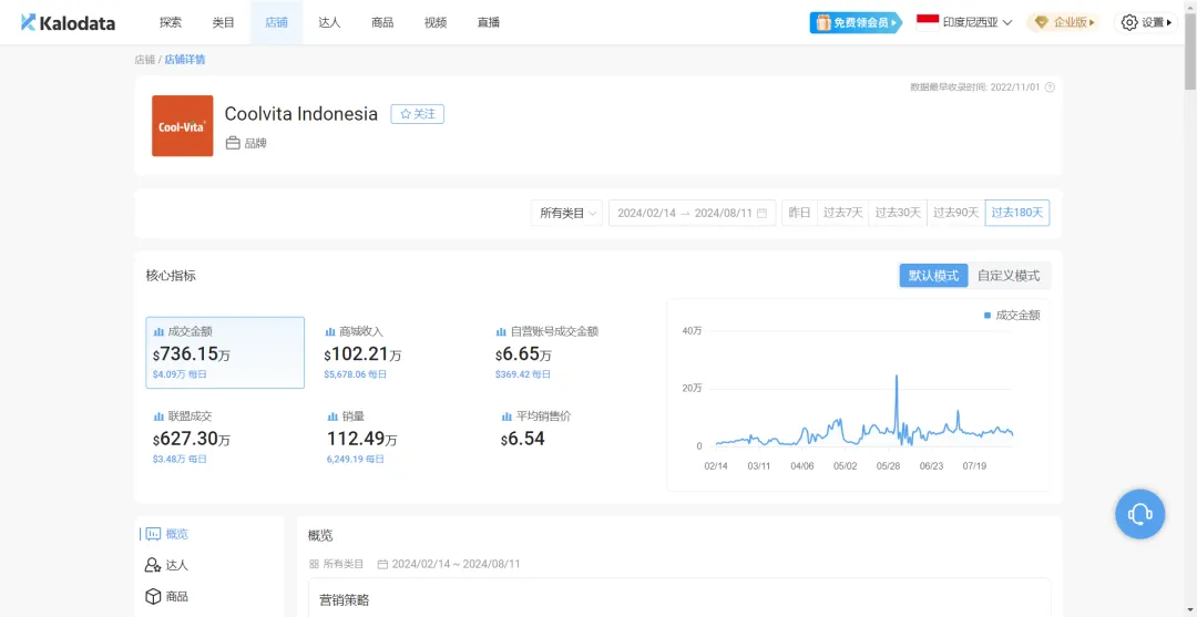 TikTok Cool-Vita是一个在印尼市场迅速崛起的保健品品牌,专注于健康和美容产品,成功在五年内成为多个平台保健品类目的领先者。根据Kalodata的数据,过去半年Coolvita Indonesia小店在TikTok印尼累计销量达112.5万件,总销售额超736万美金。小店的一款胶原蛋白泡腾片搭配果蔬风味饮料成为近30天内销量最高的产品,达到6万件。品牌以健康、年轻、时尚为定位,旨在满足女性在美容养颜、排毒瘦身和运动营养方面的需求。