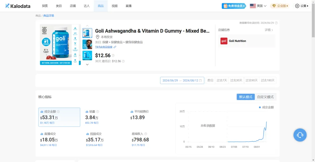 TikTok 全球营养保健品市场在2023年达到了4199.3亿美元,美国以35%的份额位居首位。Kalodata数据显示,一款维生素软糖6月29日在TikTok Shop上架,一个半月销量达3.84万单,8月份以来日均出货量超3000单,8月11日出货量高达1.07万单。所属小店Goli Nutrition主营各类保健品,共计上架8款其余口味的相似产品。但这款为销量冠军,累计为小店带来了53.31万美金的销售额。