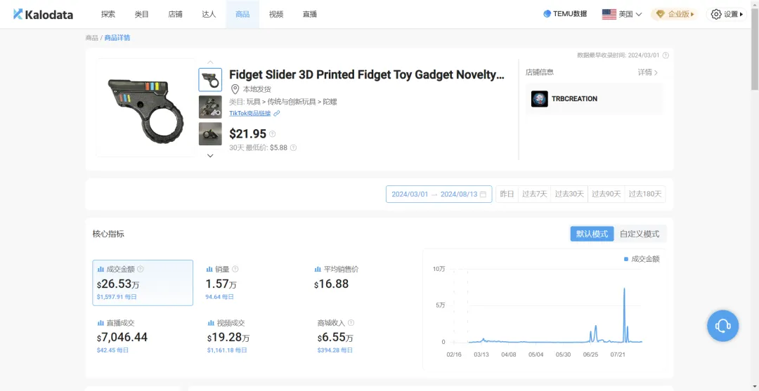 TikTok 减压玩具在全球范围内逐渐流行,尤其受到成年人的欢迎。TikTok上,#educationaltoy标签浏览量近6亿次。Fidget Slider 3D打印手枪玩具以其多样的玩法和耐用材质,成为受各年龄层欢迎的解压工具。该玩具在TikTok上走红,尤其受到年轻人的青睐。根据Kalodata数据,该玩具在TikTok最低售价5.88美元,自3月上线以来,销量达1.57万件。评论区用户表示对玩具的手感和材质表示满意,认为它既安全又无异味,声音也具有解压效果。此外,1688平台上相似产品的价格从19元起,为商家提供了可观的利润空间。