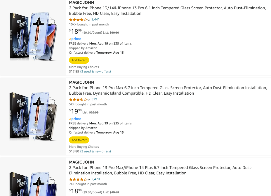 MagicJohn 在亚马逊美国站内,多款手机型号钢化膜月销量在 10000+ 单、7000 单、6000+ 单,销量十分火热。