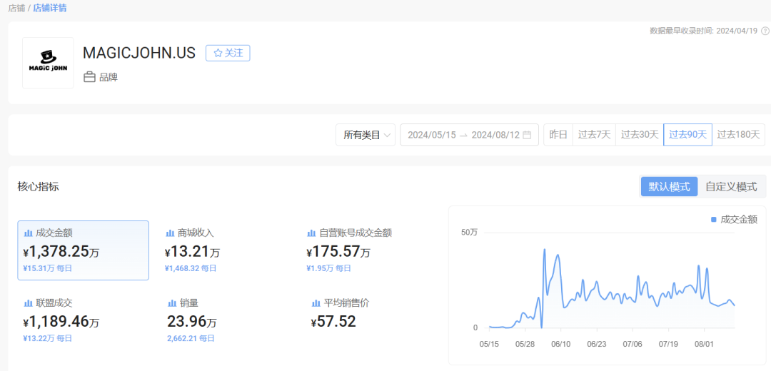 据 kalodata 相关数据显示,这款手机钢化膜是来自于 MagicJohn 品牌,过去 90 天,商品成交额达 1378.25 万元,销量超 23.96 万单,每日平均销量达 2662.21 单。