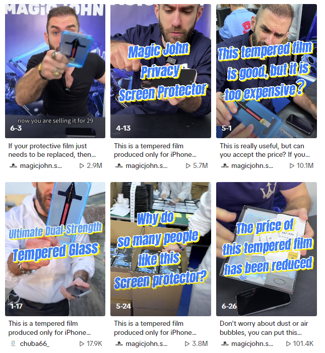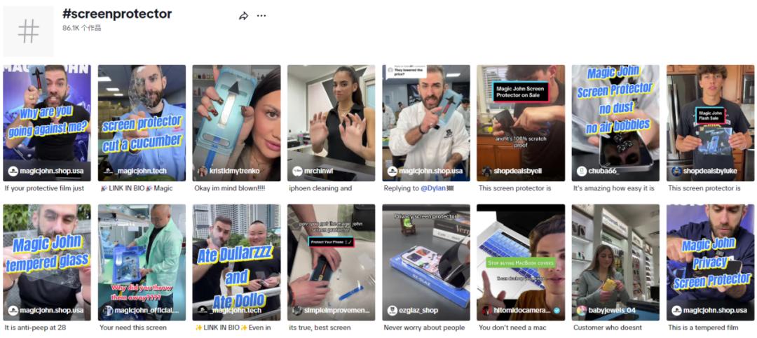 “#magicjohn”话题相关视频在 TikTok 上有 1.12 万条,许多用户购买该款钢化膜后也积极在 TikTok 上分享,进一步为品牌扩大曝光与影响力。“#screenprotector”(屏幕保护膜)在 TikTok 上有 8.61 万条视频,且视频播放量都在上万次,可见 TikTok 用户对手机屏幕保护的关注度很高。