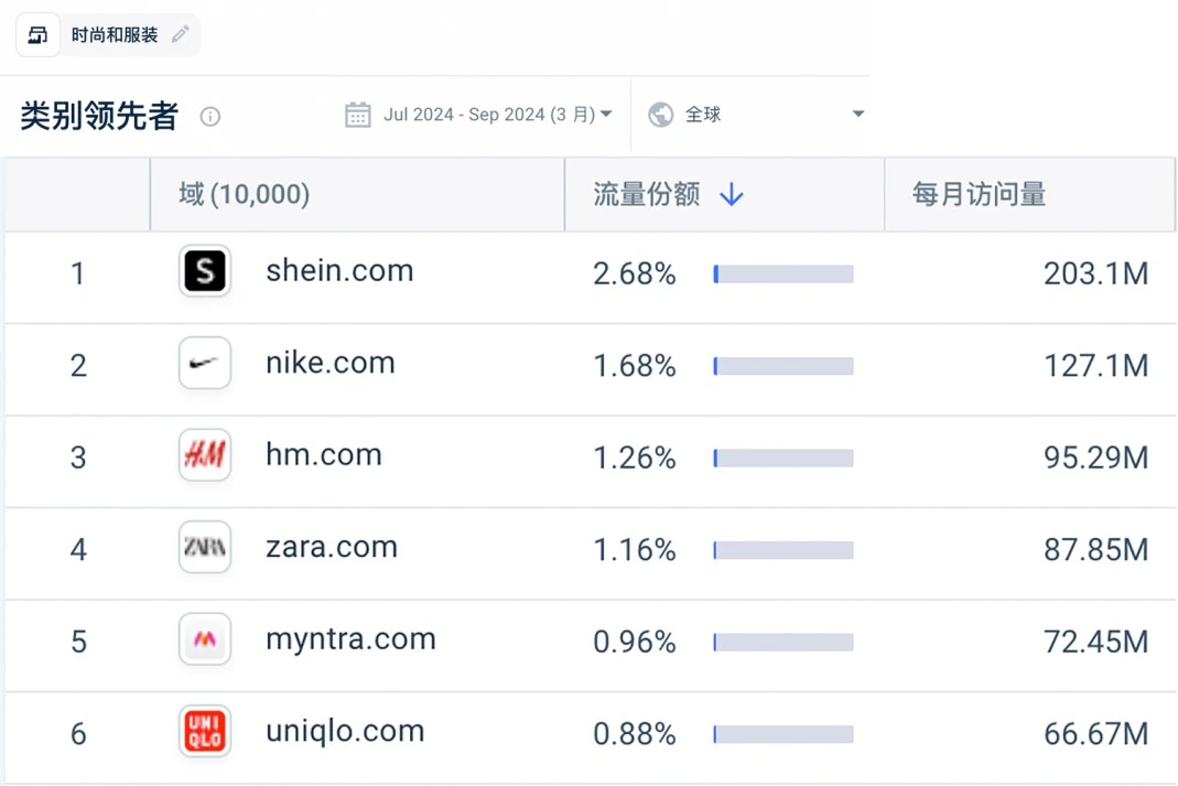 近日,根据数据分析网站Similarweb数据显示,SHEIN(希音)成为2024年9月以及第三季度全球访问量最大的服装与时尚品牌,第三季度流量份额占比为2.68%。