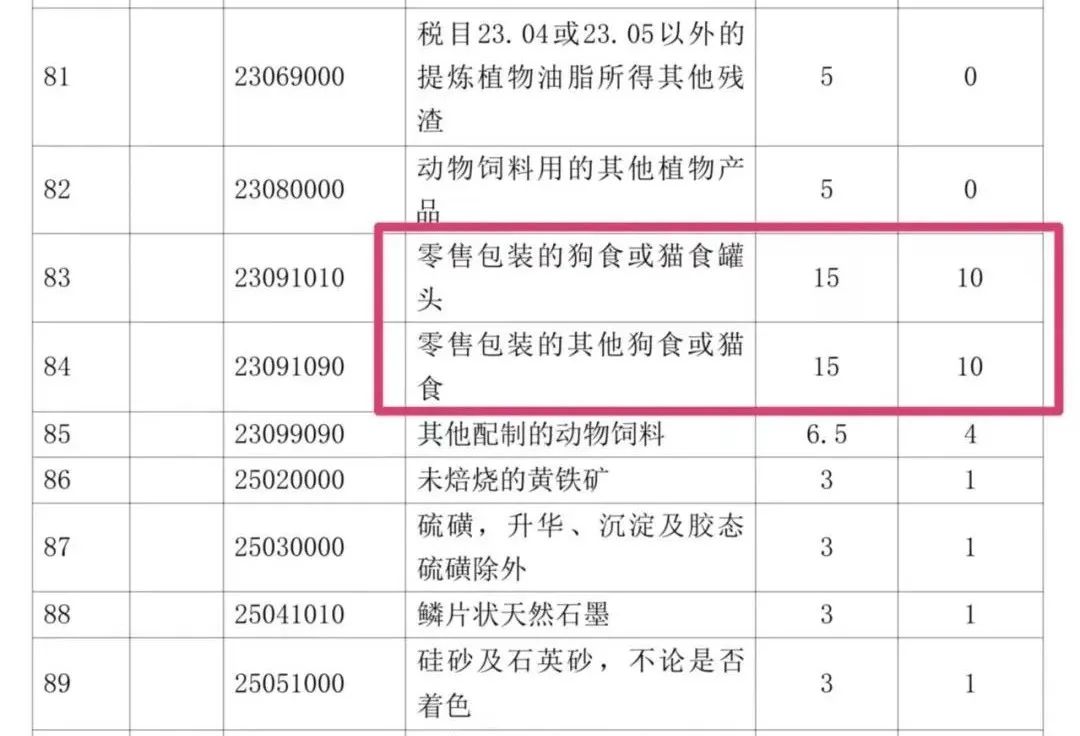 具体来看,对于零售包装的狗食或猫食罐头,将实行最惠国税率15%,暂定税率10%;零售包装的其他狗食或猫食将实行最惠国税率15%,暂定税率10%。