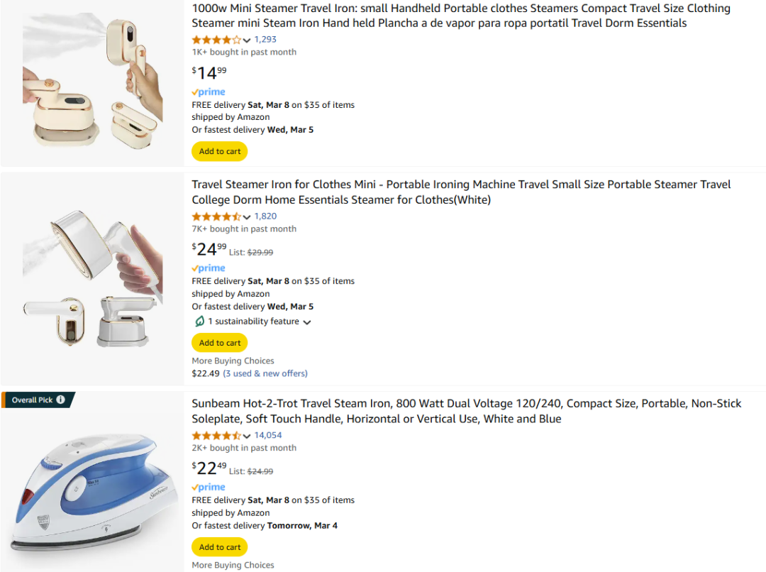 亚马逊美国站搜索“Mini Travel Iron for Clothes”,除了这款迷你旅行熨斗爆卖之外,类似于该产品的多款旅行熨斗销量也很火爆,售价在14.99美元——24.99美元之间,上个月销量超7000+单。