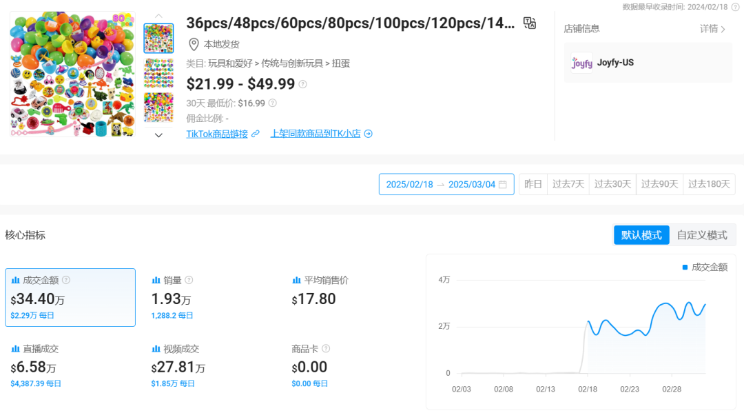 进入3月,复活节的节日氛围已在欧美市场悄然升温,消费者开始为这一天做准备,据Kalodata数据显示,TikTok上一款彩蛋玩具悄然走红,在过去15天内销量突破1.93万件,稳居TikTok美区玩具类目榜首,销售额为34.4万美元。