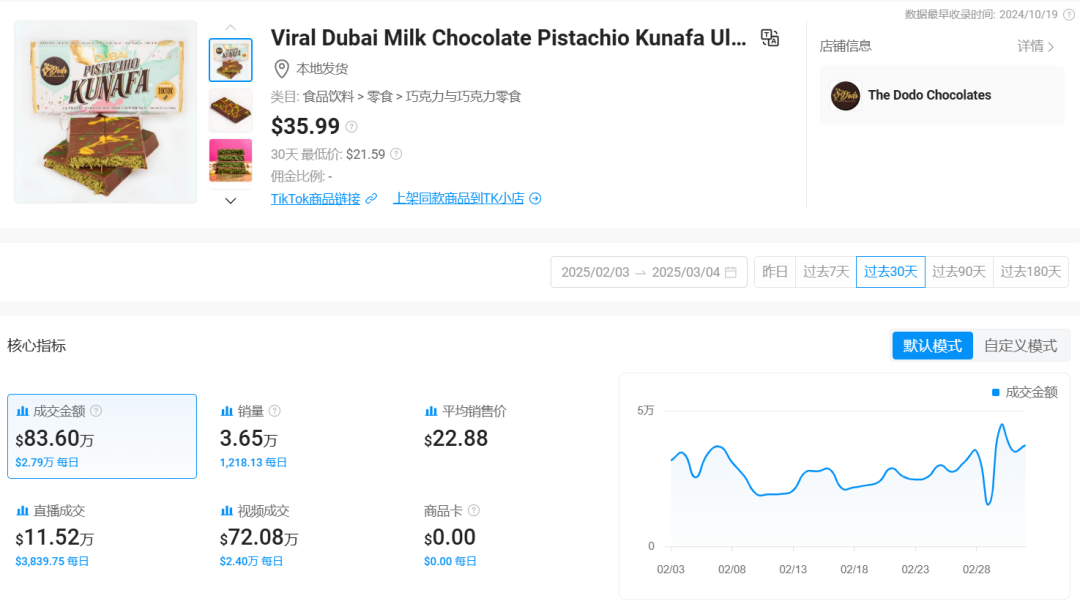 而糖果市场的火爆也不容忽视。数据显示,每年美国人在复活节期间购买的糖果总量可达数十亿颗,从巧克力兔到糖果篮,都是高频消费品类。一款迪拜巧克力棒花生酱在TikTok食品饮料类目中热销,30天内卖出3.65万单,月销售额为83.6万美元。这些数据表明,消费者的购物需求已经提前释放,TikTok上的节日热销品类正迎来爆发期。