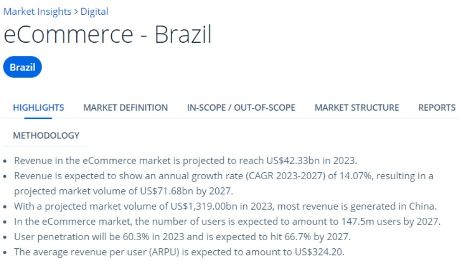 此外,来自Statista的数据同样彰显了巴西市场的电商潜力。数据显示,2023年巴西电商市场规模将达到42.3亿美元,预计2023年至2027年的复合年增长率达到14.07%,到2027年市场规模增至716.8亿美元。