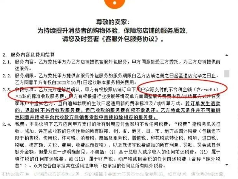 就在近期,有卖家发现Temu发布了一份名为《客服外包服务协议》的新协议。根据该协议内容,甲方有权按照顾客实际支付订单金额(不含税,包括credit)的5‰比例收取服务费用。此消息一出,一时之间在跨境卖家圈内引起了热议,也招致了诸多不满。