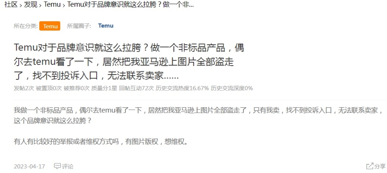 此外,近期Temu还出现了产品大量下架的情况,有卖家表示这可能是因为Temu正在进行“合规整改+爆仓退供”,也有可能是因为侵权问题。细细想来这也合理,毕竟Temu一直以来就深陷盗图、侵权、抄袭等乱象的舆论漩涡之中。之前就因为搬运亚马逊卖家在售Listing而卷入诉讼纷争,与SHEIN也有类似纠纷。