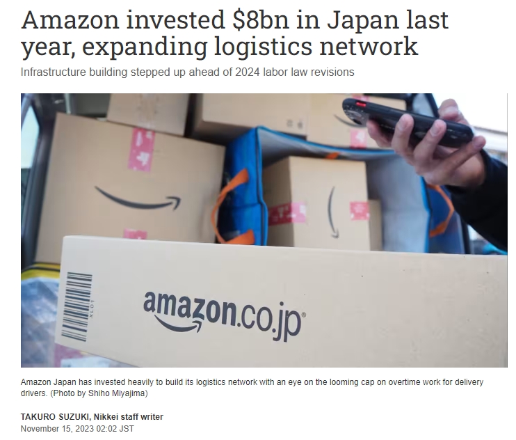 亚马逊日本公司投入巨资建设其网络,着眼于迫在眉睫的“2024 年问题”,预计将于 4 月生效的修订后的劳工标准法案将引发物流瓶颈,该法案将限制送货司机的加班工作。