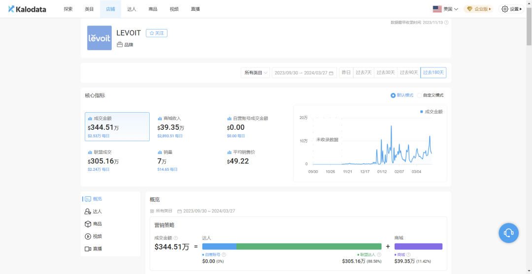 TikTok 空气净化器市场迅速崛起,LEVOIT在TikTok小店表现抢眼,据Kalodata数据显示,历史总销量7万,销售额约344.51万美元。其中一款多功能空气净化器在TikTok小店中销量突出,超过6万销量。Levoit品牌属Vesync旗下,主打空气净化器、加湿器等产品,以北美为主要销售市场,欧洲市场也在扩大。