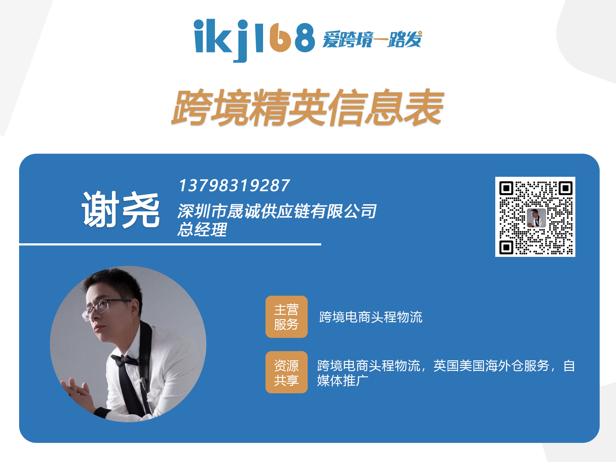 信息资料 公 司 名:深圳市晟诚供应链有限公司 姓 名:谢尧 籍 贯:江西景德镇 手 机 号:13798319287 公司地址:深圳市龙岗区富安大道亚钢1号11楼1119 职 务:总经理 主营服务:跨境电商头程物流 可共享资源:跨境电商头程物流,英国美国海外仓服务,自媒体推广