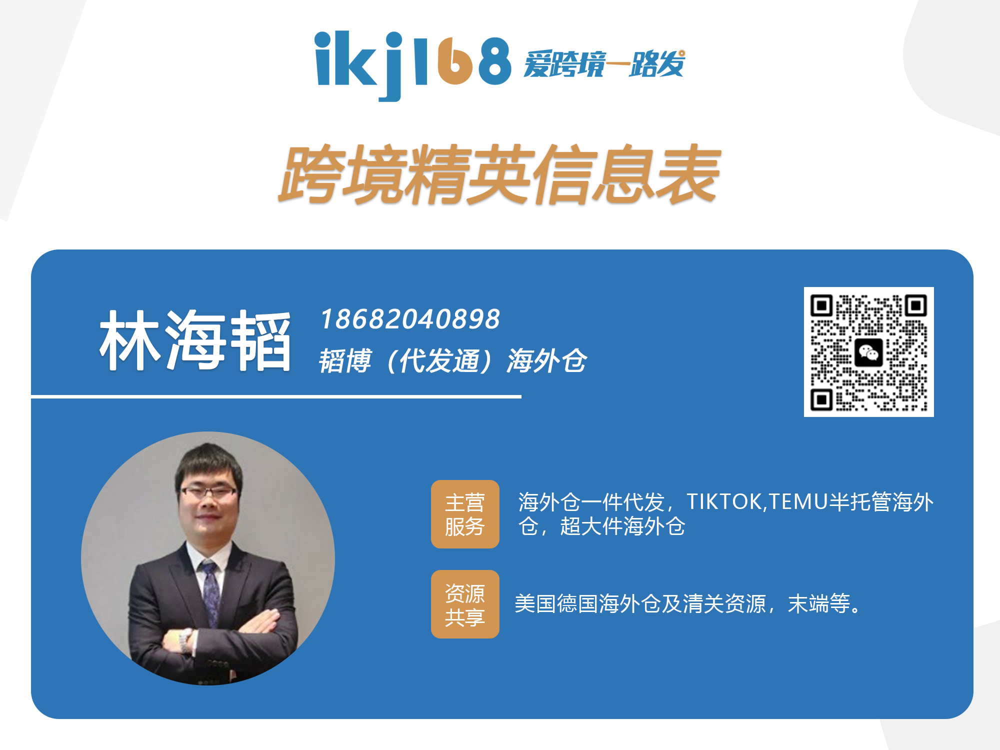 信息资料 公 司 名:韬博(代发通)海外仓 姓 名:林海韬 籍 贯:湖南 手 机 号:18682040898 公司地址:深圳市龙华区硅谷大院T3-305 职 务:总经理 主营服务:海外仓一件代发,TIKTOK,TEMU半托管海外仓,超大件海外仓 可共享资源:美国德国海外仓及清关资源,末端等。
